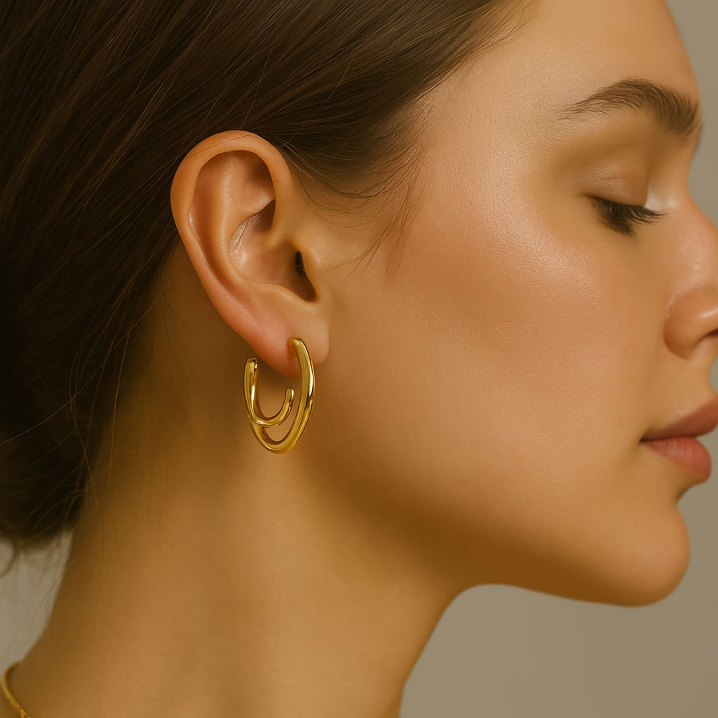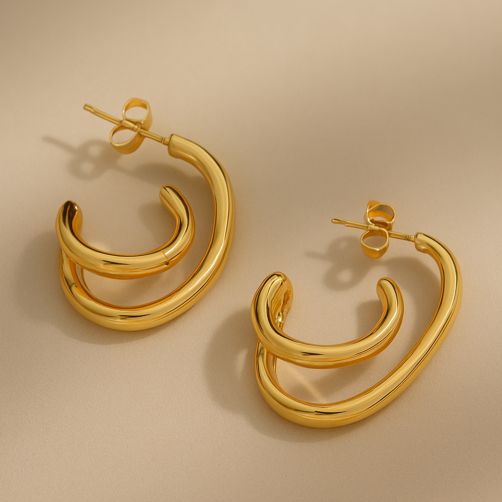 Tout en douceur, les boucles Oria mêlent courbes irrégulières et reflets dorés pour une allure subtilement sophistiquée. Inspirées du mouvement naturel du métal, elles apportent une touche d’originalité discrète à une silhouette épurée.